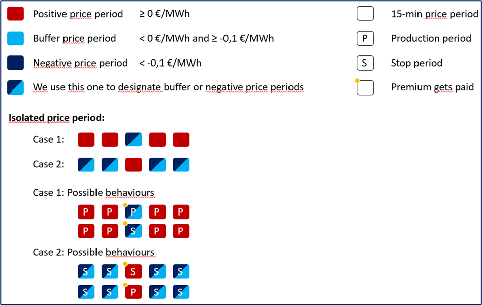 In principle, curtailment decisions should scale with the depth of negative prices — the more negative the signal, the stronger the incentive to reduce output. To approximate this, a buffer price window was introduced: within the [-0.1 €/MWh; -0.01 €/MWh[ range, producers receive the negative price premium whether they curtail or continue producing. In practice, however, the measure has had little discernible effect on producer behaviour.